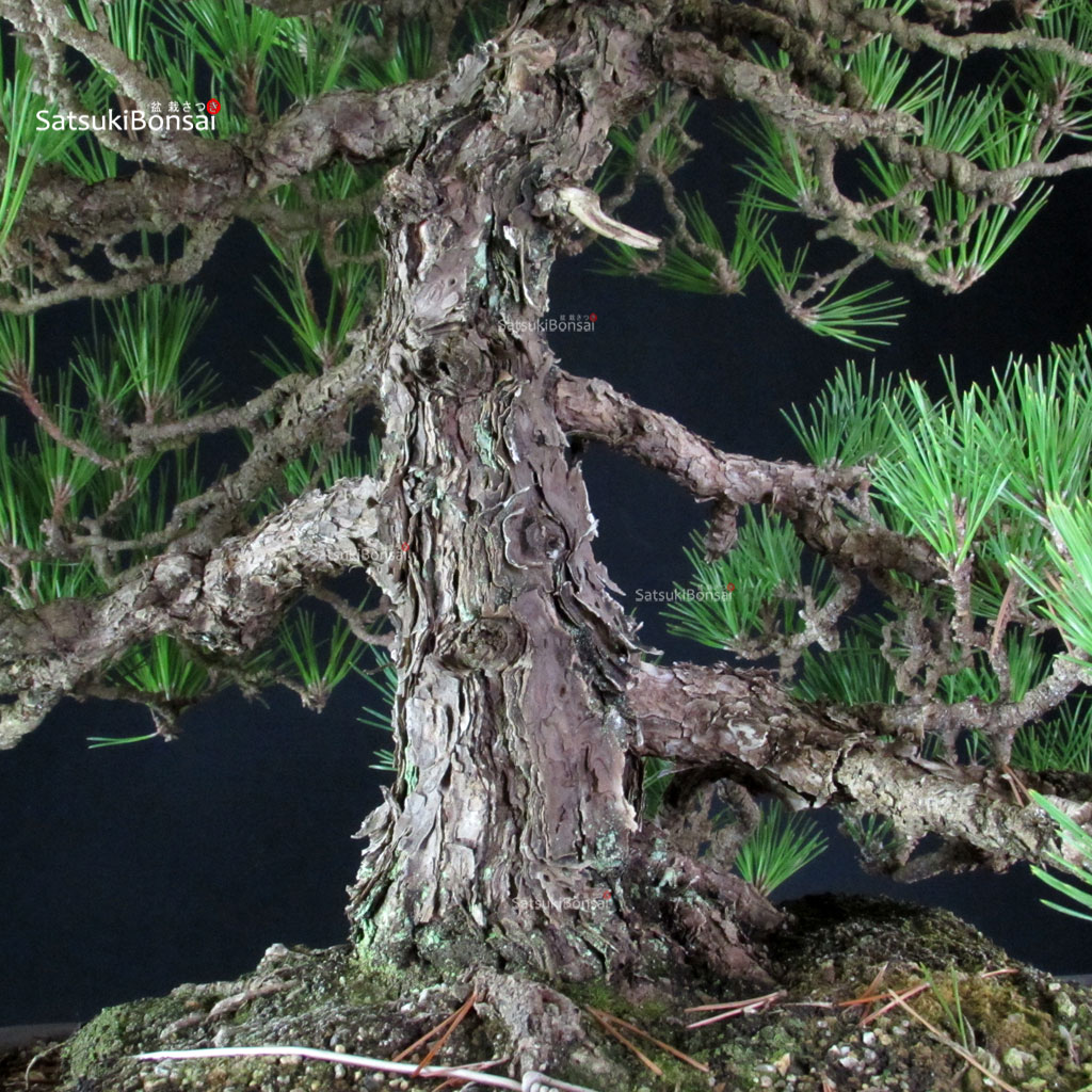 Bonsai di pino nero (Pinus Thunbergii – Kuromatsu). Ramificazione molto fine, ago corto, corteccia finemente scagliata. Pianta molto vecchia dalla corteccia eccezionale.